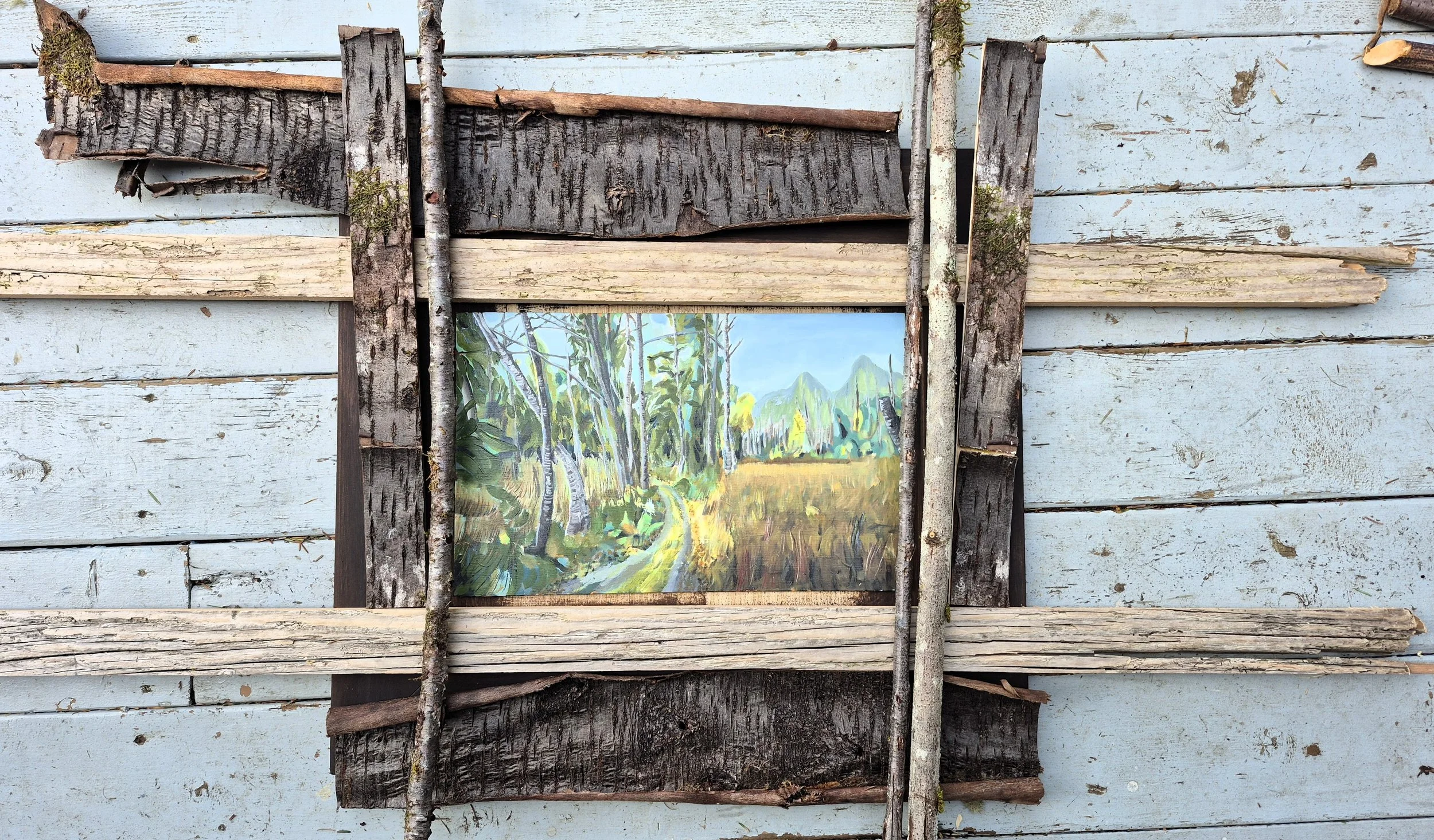 On the workbench: strips of painted wood, driftwood, bark, cherry, maple sticks, small logs and shaggy cedar bark are gathered from the surrounding forest. Pieces are moved, held up, adjusted. Nothing is forced. The painting usually suggests what it needs.