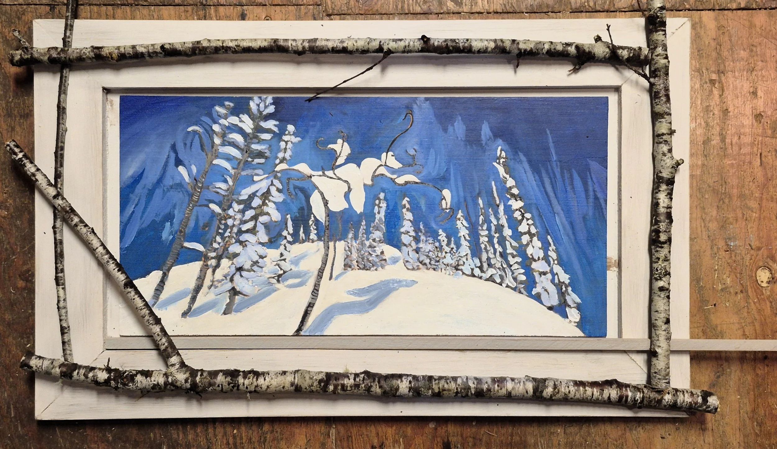 After decades of building furniture, working with wood feels instinctive. Now that craft meets painting. The frame becomes part of the landscape — the forest surrounding the forest.
